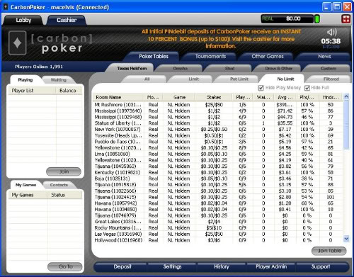 Overall Review Carbon Poker is still relatively new to the online poker market but is currently the most popular poker room on the Merge Network. Carbon Poker's real money player statistics currently show 1,700 ring game players and 6,000 tournament players at peak hours as of December 2011. Traffic is expected to continue increasing with the growing popularity of the Merge gaming network though.Carbon Poker offers poker at every variation and stake including Texas Holdem, Omaha and Seven Card Stud in all versions, H.O.R.S.E. and other mixed games, Razz, Five Card Stud, Five Card Draw, A-5 Lowball, 2-7 Lowball and Badugi. The stakes range from play money and micro limits to $25/$50. The Carbon Poker player base is full of loose and inexperienced players which makes playing there very profitable, even at the micro stakes. On top of the initial deposit bonus mentioned above Carbon Poker's promotions include a frequent player program where you earn VIP points for playing raked hands at ring games or buy in fees for tournaments and you can use these points to buy into restricted freerolls when you reach different VIP statuses. They also started a new freeroll schedule as of April 2009 that offers $50 freerolls open to everyone at least every four hours, weekly freerolls worth $2,000-$10,000 and a monthly $50,000 freeroll. Another good promotion from Carbon Poker is the Royal Flush bonus that pays out 100 times the big blind up to $1,000 just for hitting a royal flush. The Carbon Poker software is very innovative, has clean graphics and offers great functionality. Some of the special software features include a "rabbit hunt" feature allowing players to see the next card in the deck on a folded hand and a "show one card feature".� Overall Carbon Poker delivers a good poker experience but is still lacking in the high stakes department. With the growing poularity of the Merge Network I predict that the high stakes tables will be filling up soon though. |